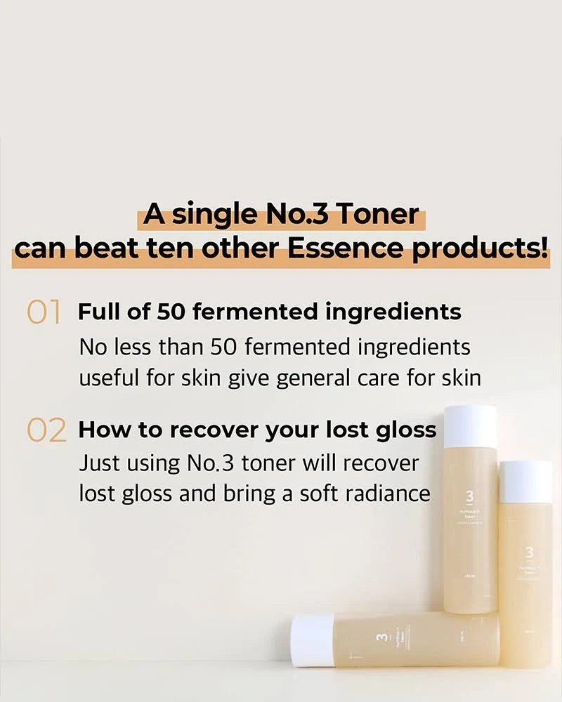 Elevate your skincare routine with the [Numbuzin] No.3 Super Glowing Essence Toner — a game-changing essence toner that delivers glass-like radiance, intense hydration, and a smoother skin texture in one step. Formulated with over 50 fermented ingredients, including Bifida Ferment Lysate and Galactomyces Ferment Filtrate, this toner is designed to deeply nourish, brighten, and restore skin vitality.