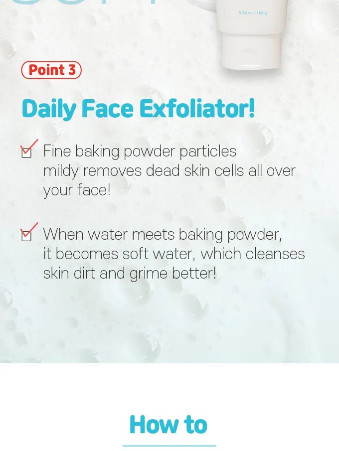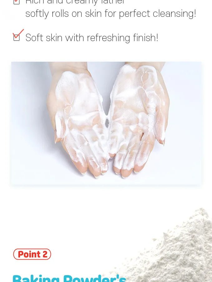 • Enriched with Baking Powder: Baking powder is well known for its ability to break down and remove impurities, leaving your skin feeling deeply cleansed and more refined.